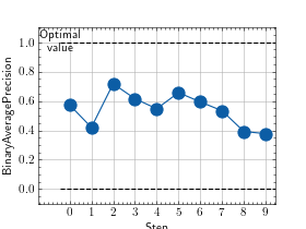 >>> # Example plotting multiple values >>> import torch >>> from torchmetrics.classification import BinaryAveragePrecision >>> metric = BinaryAveragePrecision() >>> values = [ ] >>> for _ in range(10): ... values.append(metric(torch.rand(20,), torch.randint(2, (20,)))) >>> fig_, ax_ = metric.plot(values)