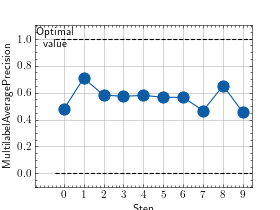 >>> # Example plotting multiple values >>> import torch >>> from torchmetrics.classification import MultilabelAveragePrecision >>> metric = MultilabelAveragePrecision(num_labels=3) >>> values = [ ] >>> for _ in range(10): ... values.append(metric(torch.rand(20,3), torch.randint(2, (20,3)))) >>> fig_, ax_ = metric.plot(values)
