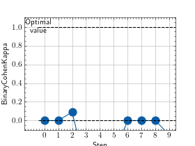 >>> from torch import rand, randint >>> # Example plotting multiple values >>> from torchmetrics.classification import BinaryCohenKappa >>> metric = BinaryCohenKappa() >>> values = [ ] >>> for _ in range(10): ... values.append(metric(rand(10), randint(2,(10,)))) >>> fig_, ax_ = metric.plot(values)