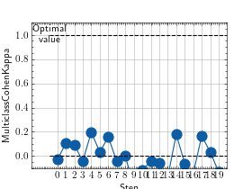 >>> from torch import randn, randint >>> # Example plotting a multiple values >>> from torchmetrics.classification import MulticlassCohenKappa >>> metric = MulticlassCohenKappa(num_classes=3) >>> values = [] >>> for _ in range(20): ... values.append(metric(randn(20,3).softmax(dim=-1), randint(3, (20,)))) >>> fig_, ax_ = metric.plot(values)