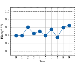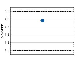 \[\text{EER} = \frac{\text{FAR} + (1 - \text{FRR})}{2}, \text{where} \min_t abs(FAR_t-FRR_t)\]The Equal Error Rate (EER) is the point where the False Positive Rate (FPR) and True Positive Rate (TPR) are equal, or in practise minimized. A lower EER value signifies higher system accuracy.