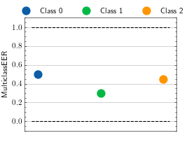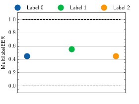 >>> # Example plotting a single >>> import torch >>> from torchmetrics.classification import MultilabelEER >>> metric = MultilabelEER(num_labels=3) >>> metric.update(torch.rand(20,3), torch.randint(2, (20,3))) >>> fig_, ax_ = metric.plot()