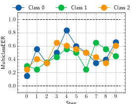 >>> # Example plotting multiple values >>> import torch >>> from torchmetrics.classification import MulticlassEER >>> metric = MulticlassEER(num_classes=3) >>> values = [ ] >>> for _ in range(10): ... values.append(metric(torch.randn(20, 3), torch.randint(3, (20,)))) >>> fig_, ax_ = metric.plot(values)