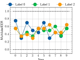 >>> # Example plotting multiple values >>> import torch >>> from torchmetrics.classification import MultilabelEER >>> metric = MultilabelEER(num_labels=3) >>> values = [ ] >>> for _ in range(10): ... values.append(metric(torch.rand(20,3), torch.randint(2, (20,3)))) >>> fig_, ax_ = metric.plot(values)