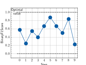 >>> from torch import rand, randint >>> # Example plotting multiple values >>> from torchmetrics.classification import BinaryF1Score >>> metric = BinaryF1Score() >>> values = [ ] >>> for _ in range(10): ... values.append(metric(rand(10), randint(2,(10,)))) >>> fig_, ax_ = metric.plot(values)