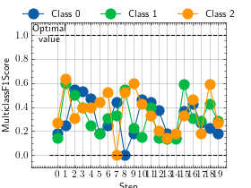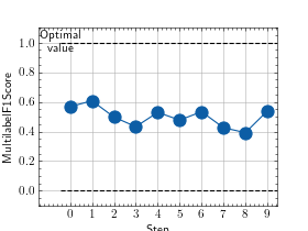 >>> from torch import rand, randint >>> # Example plotting multiple values >>> from torchmetrics.classification import MultilabelF1Score >>> metric = MultilabelF1Score(num_labels=3) >>> values = [ ] >>> for _ in range(10): ... values.append(metric(randint(2, (20, 3)), randint(2, (20, 3)))) >>> fig_, ax_ = metric.plot(values)