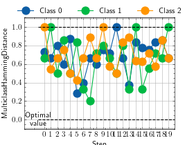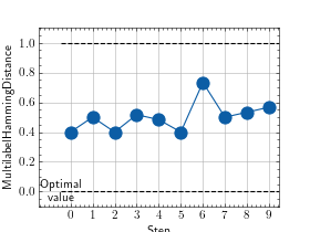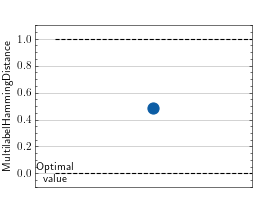 \[\text{Hamming distance} = \frac{1}{N \cdot L} \sum_i^N \sum_l^L 1(y_{il} \neq \hat{y}_{il})\]Where \(y\) is a tensor of target values, \(\hat{y}\) is a tensor of predictions, and \(\bullet_{il}\) refers to the \(l\)-th label of the \(i\)-th sample of that tensor.