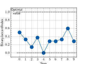 >>> # Example plotting multiple values >>> from torch import rand, randint >>> from torchmetrics.classification import BinaryJaccardIndex >>> metric = BinaryJaccardIndex() >>> values = [ ] >>> for _ in range(10): ... values.append(metric(rand(10), randint(2,(10,)))) >>> fig_, ax_ = metric.plot(values)