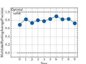 >>> from torch import rand, randint >>> # Example plotting multiple values >>> from torchmetrics.classification import MultilabelRankingAveragePrecision >>> metric = MultilabelRankingAveragePrecision(num_labels=3) >>> values = [ ] >>> for _ in range(10): ... values.append(metric(rand(20, 3), randint(2, (20, 3)))) >>> fig_, ax_ = metric.plot(values)
