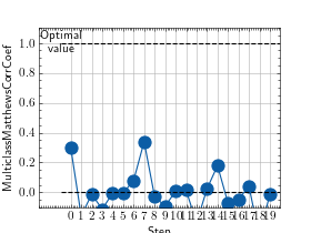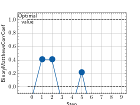 >>> from torch import rand, randint >>> # Example plotting multiple values >>> from torchmetrics.classification import BinaryMatthewsCorrCoef >>> metric = BinaryMatthewsCorrCoef() >>> values = [ ] >>> for _ in range(10): ... values.append(metric(rand(10), randint(2,(10,)))) >>> fig_, ax_ = metric.plot(values)