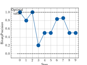 >>> from torch import rand, randint >>> # Example plotting multiple values >>> from torchmetrics.classification import BinaryPrecision >>> metric = BinaryPrecision() >>> values = [ ] >>> for _ in range(10): ... values.append(metric(rand(10), randint(2,(10,)))) >>> fig_, ax_ = metric.plot(values)