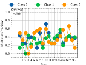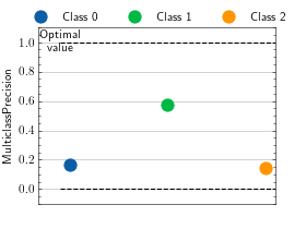 >>> from torch import randint >>> # Example plotting a multiple values per class >>> from torchmetrics.classification import MulticlassPrecision >>> metric = MulticlassPrecision(num_classes=3, average=None) >>> values = [] >>> for _ in range(20): ... values.append(metric(randint(3, (20,)), randint(3, (20,)))) >>> fig_, ax_ = metric.plot(values)