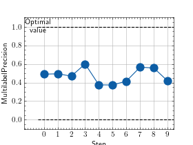 >>> from torch import rand, randint >>> # Example plotting multiple values >>> from torchmetrics.classification import MultilabelPrecision >>> metric = MultilabelPrecision(num_labels=3) >>> values = [ ] >>> for _ in range(10): ... values.append(metric(randint(2, (20, 3)), randint(2, (20, 3)))) >>> fig_, ax_ = metric.plot(values)