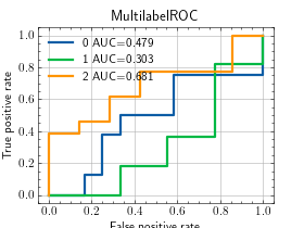 >>> from torch import rand, randint >>> from torchmetrics.classification import MultilabelROC >>> preds = rand(20, 3) >>> target = randint(2, (20,3)) >>> metric = MultilabelROC(num_labels=3) >>> metric.update(preds, target) >>> fig_, ax_ = metric.plot(score=True)