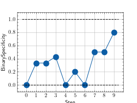 >>> from torch import rand, randint >>> # Example plotting multiple values >>> from torchmetrics.classification import BinarySpecificity >>> metric = BinarySpecificity() >>> values = [ ] >>> for _ in range(10): ... values.append(metric(rand(10), randint(2,(10,)))) >>> fig_, ax_ = metric.plot(values)