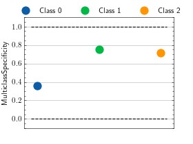 >>> from torch import randint >>> # Example plotting a single value per class >>> from torchmetrics.classification import MulticlassSpecificity >>> metric = MulticlassSpecificity(num_classes=3, average=None) >>> metric.update(randint(3, (20,)), randint(3, (20,))) >>> fig_, ax_ = metric.plot()