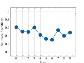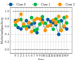 >>> from torch import rand, randint >>> # Example plotting multiple values >>> from torchmetrics.classification import MultilabelSpecificity >>> metric = MultilabelSpecificity(num_labels=3) >>> values = [ ] >>> for _ in range(10): ... values.append(metric(randint(2, (20, 3)), randint(2, (20, 3)))) >>> fig_, ax_ = metric.plot(values)