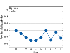 >>> # Example plotting multiple values >>> import torch >>> from torchmetrics.clustering import FowlkesMallowsIndex >>> metric = FowlkesMallowsIndex() >>> values = [ ] >>> for _ in range(10): ... values.append(metric(torch.randint(0, 4, (10,)), torch.randint(0, 4, (10,)))) >>> fig_, ax_ = metric.plot(values)