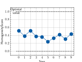 >>> # Example plotting multiple values >>> import torch >>> from torchmetrics.clustering import HomogeneityScore >>> metric = HomogeneityScore() >>> values = [ ] >>> for _ in range(10): ... values.append(metric(torch.randint(0, 4, (10,)), torch.randint(0, 4, (10,)))) >>> fig_, ax_ = metric.plot(values)