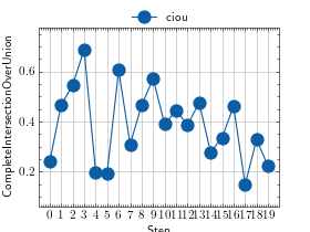 >>> # Example plotting multiple values >>> import torch >>> from torchmetrics.detection import CompleteIntersectionOverUnion >>> preds = [ ... { ... "boxes": torch.tensor([[296.55, 93.96, 314.97, 152.79], [298.55, 98.96, 314.97, 151.79]]), ... "scores": torch.tensor([0.236, 0.56]), ... "labels": torch.tensor([4, 5]), ... } ... ] >>> target = lambda : [ ... { ... "boxes": torch.tensor([[300.00, 100.00, 315.00, 150.00]]) + torch.randint(-10, 10, (1, 4)), ... "labels": torch.tensor([5]), ... } ... ] >>> metric = CompleteIntersectionOverUnion() >>> vals = [] >>> for _ in range(20): ... vals.append(metric(preds, target())) >>> fig_, ax_ = metric.plot(vals)