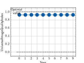 >>> # Example plotting multiple values >>> import torch >>> from torchmetrics.image import UniversalImageQualityIndex >>> preds = torch.rand([16, 1, 16, 16]) >>> target = preds * 0.75 >>> metric = UniversalImageQualityIndex() >>> values = [ ] >>> for _ in range(10): ... values.append(metric(preds, target)) >>> fig_, ax_ = metric.plot(values)
